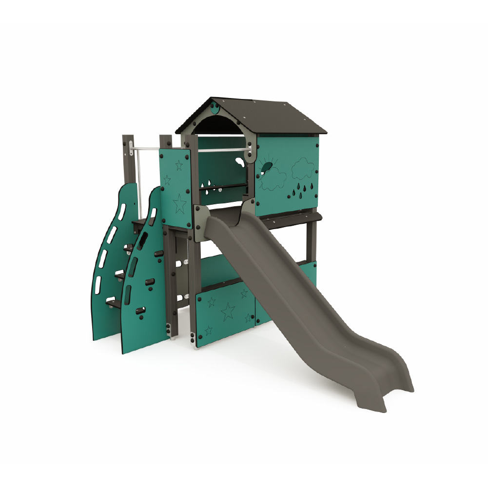 Structure consisting of a two-storey tower with a gabled roof and a platform that can be accessed via a 19 mm polyethylene sloping ladder. At the bottom of the tower there is a small shop with a counter and a stool. At the top of the tower there is a slide and a small cabin with seats.