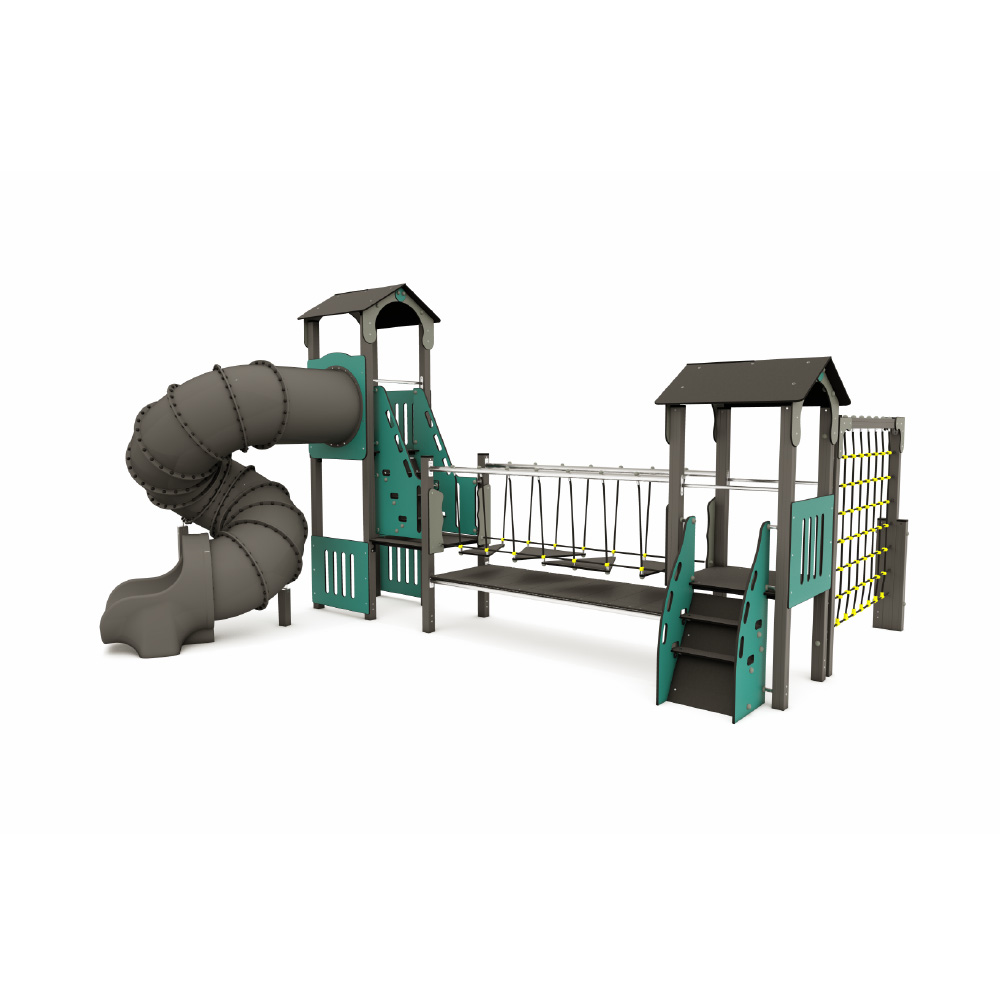 Ensemble composé de deux tours de hauteurs différentes avec des toits à deux versants. Une tour avec une plate-forme de 150 x 100 cm et une hauteur de plate-forme de 0,90 m. L’autre tour avec une plate-forme de 100 x 100 cm et une hauteur de plate-forme de 1,90 m. Les tours sont reliées entre elles par un pont suspendu en équilibre sur des cordes avec une structure de sécurité fixe en dessous. L’accès à l’une des tours se fait par un escalier incliné, cette tour est également équipée d’un filet à grimper. L’autre tour est équipée d’un toboggan en spirale, hauteur de sortie du toboggan 1,90 m.