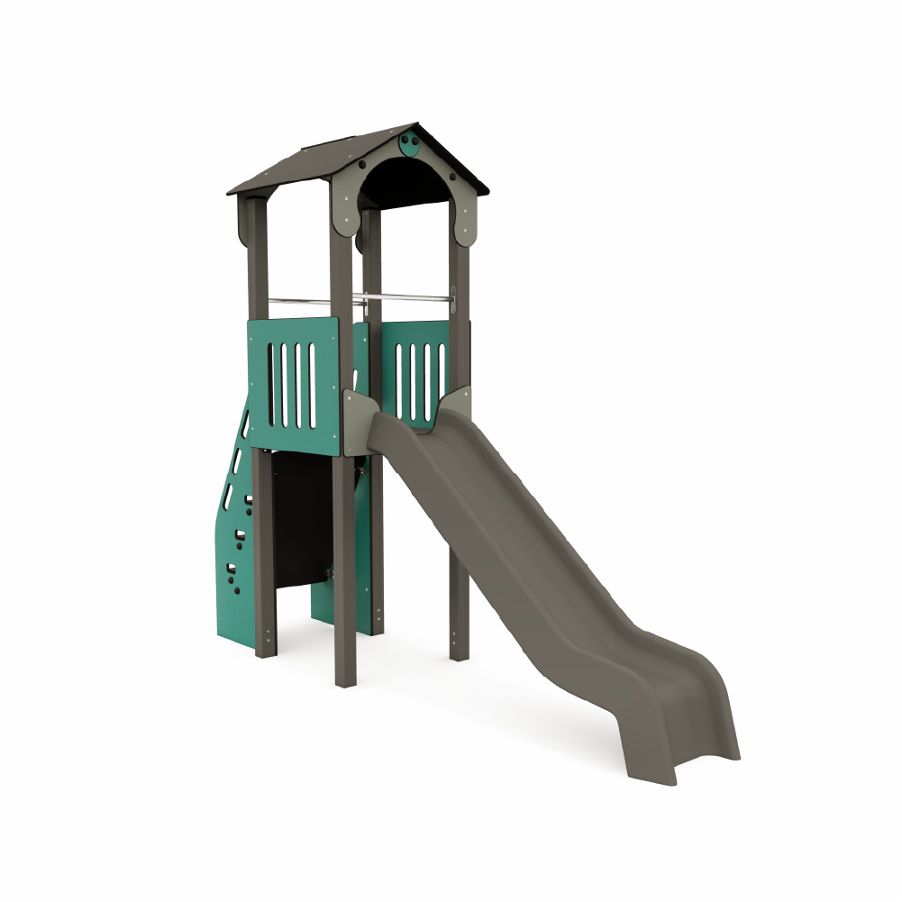 Ensemble composé d’une tour avec une plate-forme de 100 x 100 cm avec toit à deux versants. Hauteur de la plate-forme : 1,50 m. Accès à la plate-forme par un escalier avec panneaux de protection latéraux et panneau arrière fermé. Descente de la tour par un toboggan droit.