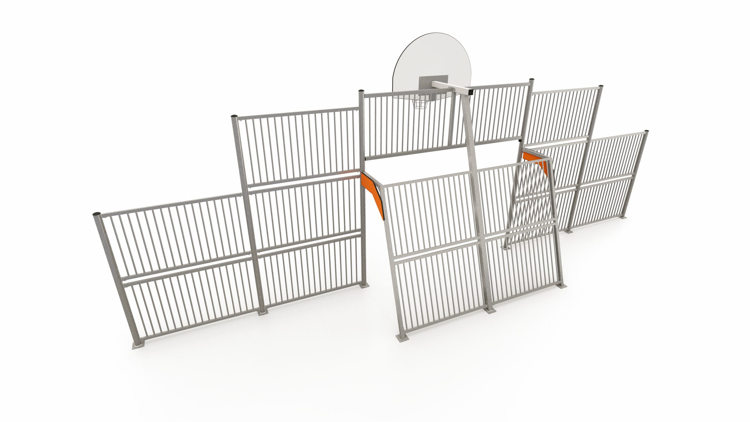 Frontal de pista Multisport fabricado con postes en acero galvanizado de ø80x3mm. Módulos compuestos por tubo en acero galvanizado de 40x30x1,5mm y barras de ø20mm. Cada módulo tiene 4 conteras en los extremos fabricadas en PELD (polietileno de baja densidad) que reducen la vibración y el nivel de ruido. Portería con dimensiones reglamentarias (2x3m) en acero galvanizado en caliente con frontal y laterales compuestos por tubos de 50x50x1,5mm y red a modo de barrotes de ø20mm (anti-vandálico). Tubo central de canasta de 80x80x3mm y altura de la canasta con dimensión reglamentaria (3,05m). Entrada lateral accesibles por silla de ruedas y con paneles en escuadra fabricados en HDPE de 19mm de espesor. Los conjuntos de pistas Multisport son modulares, sus dimensiones se pueden acoplar a cualquier área, por lo que se puede personalizar en función de las necesidades. Disponible con entradas laterales tipo burladero, mini-porterías, postes y red de tenis/voleibol. Para la instalación atornillada a una solera de hormigón existente o a realizar. La superficie del campo puede ser con pintura acrílica encima de la solera de hormigón, con pavimento deportivo, césped artificial u otros según demanda.