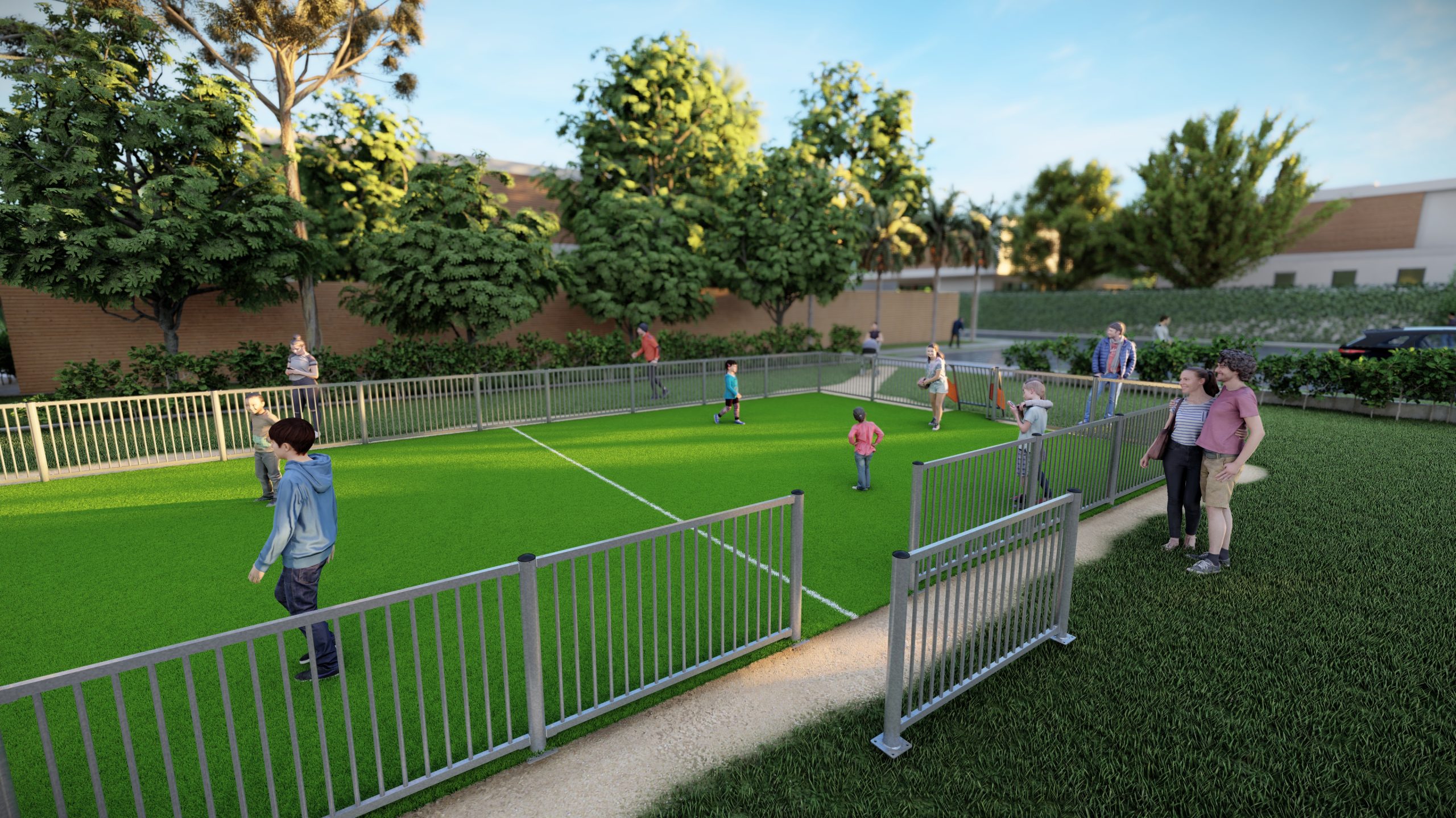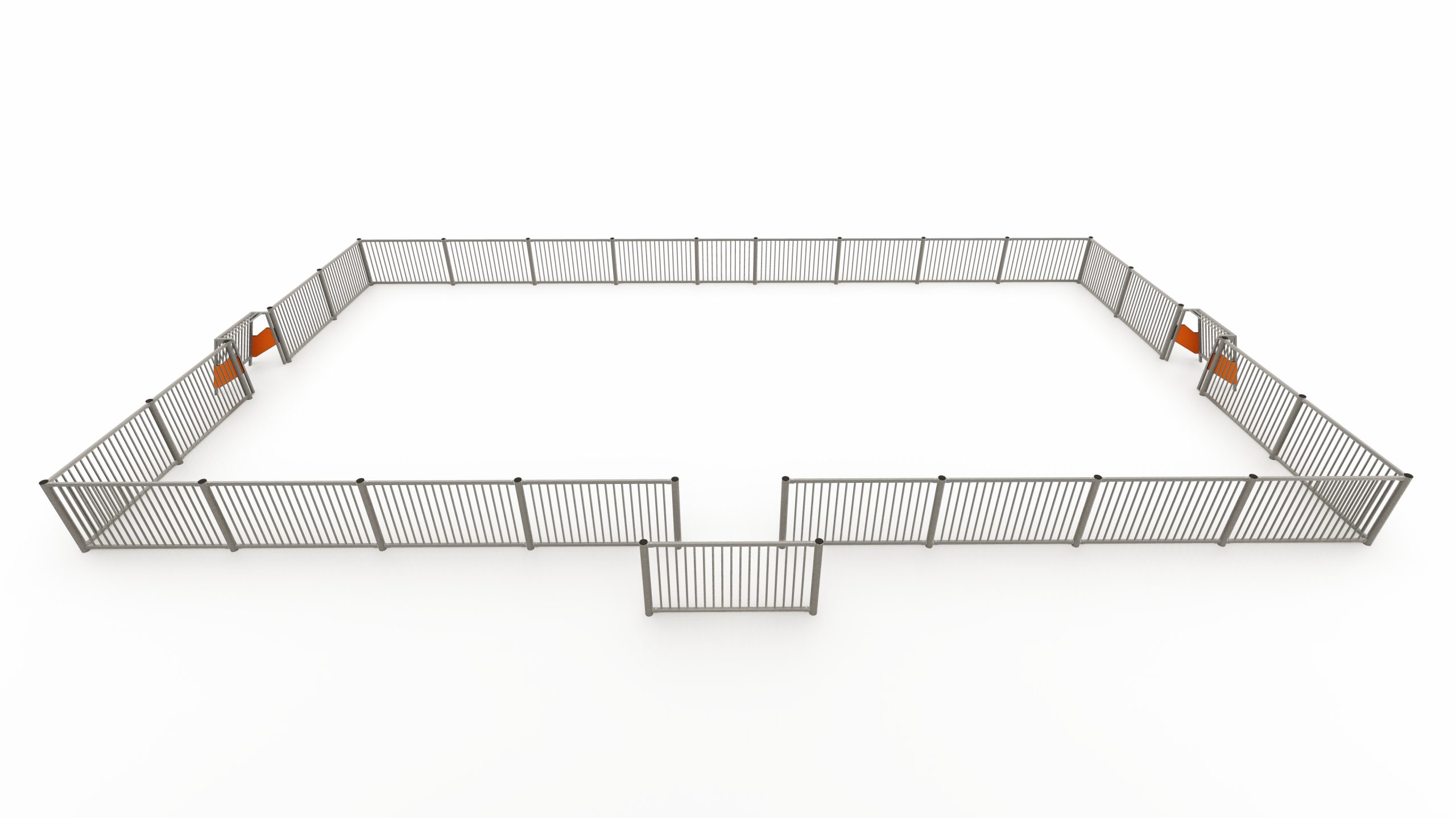 Mini porterías de 0,62x1x1m fabricadas por tubos en acero galvanizado de 40x30x1,5mm, barras de ø20mm y laterales con paneles en HDPE de 19mm de espesor. Entrada mediante vallado tipo burladero con ancho accesible por personas en silla de ruedas.