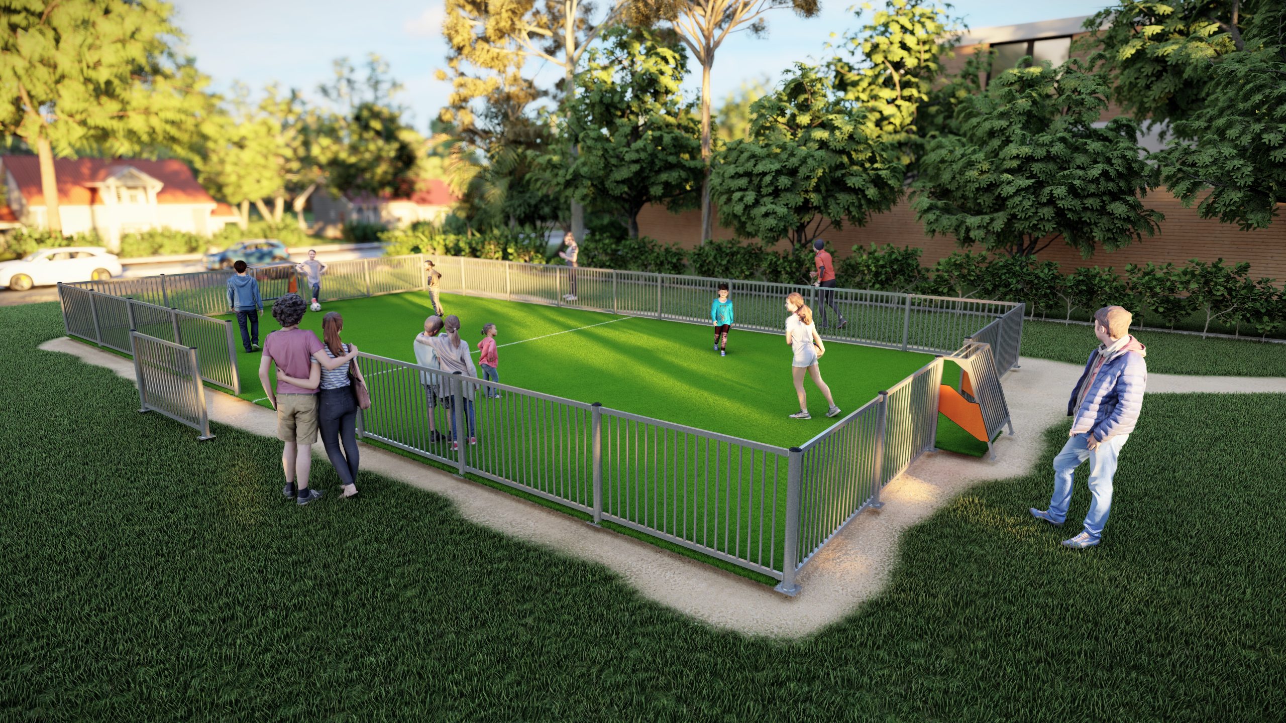 Mini pista Multisport de 14,80×8,50m especialmente diseñada para jugar a futbol 3×3, fabricada con postes en acero galvanizado de ø80x3mm.