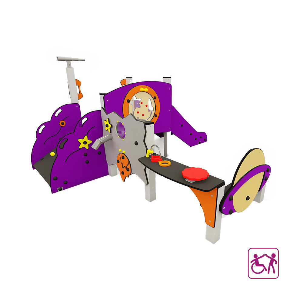 Conjunto de juego con temática espacial compuesto por una torre de 58 cm de altura y paneles con actividades sensoriales ubicadas a nivel del suelo, diseñadas para el juego con arena. El diseño simula un viaje por el espacio y está orientado a fomentar el juego de rol, así como el desarrollo sensorial, cognitivo y socioemocional de los niños.