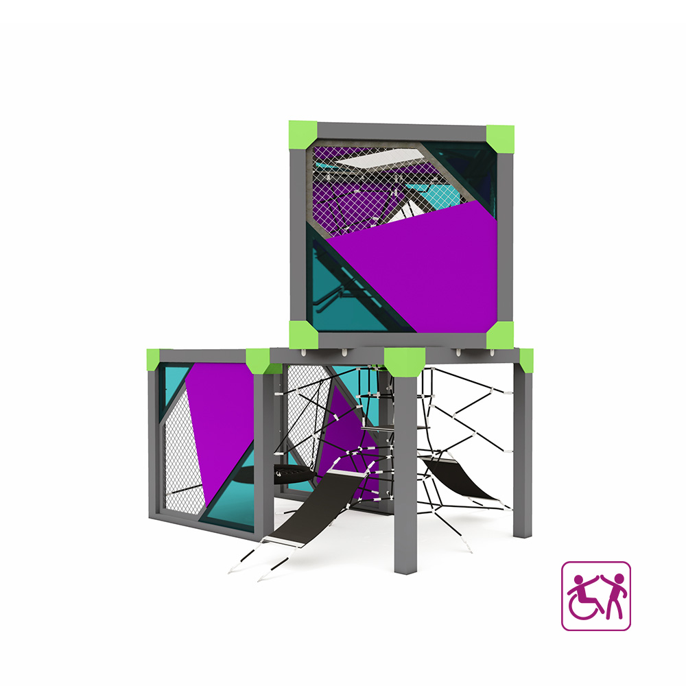 El conjunto VERTEX está formado por 3 cubos, dos de ellos interconectados con cuerdas de trepa. El acceso se realiza mediante la red de cuerdas de trepa y lonas de goma con incrustaciones textiles. Uno de los módulos integra un asiento cesta, diseñado como un espacio acogedor y de encuentro para que varios niños puedan descansar y disfrutar del juego en grupo. Esta zona favorece la socialización, inclusión y creación de vínculos a través del juego tranquilo en un entorno lúdico.