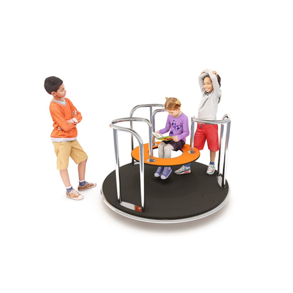 Carrusel con un diámetro de 1,5 metros. La estructura superior está fabricada en acero inoxidable con tubos de ø40mm, lo que garantiza durabilidad y resistencia al uso intensivo. Plataforma fabricada en contrachapado fenólico antideslizante de 18mm de espesor y panel central en HDPE (polietileno de alta densidad) de espesor 19mm . Esta disposición permite a los niños descansar, favoreciendo la inclusión y alternancia entre movimiento y reposo.