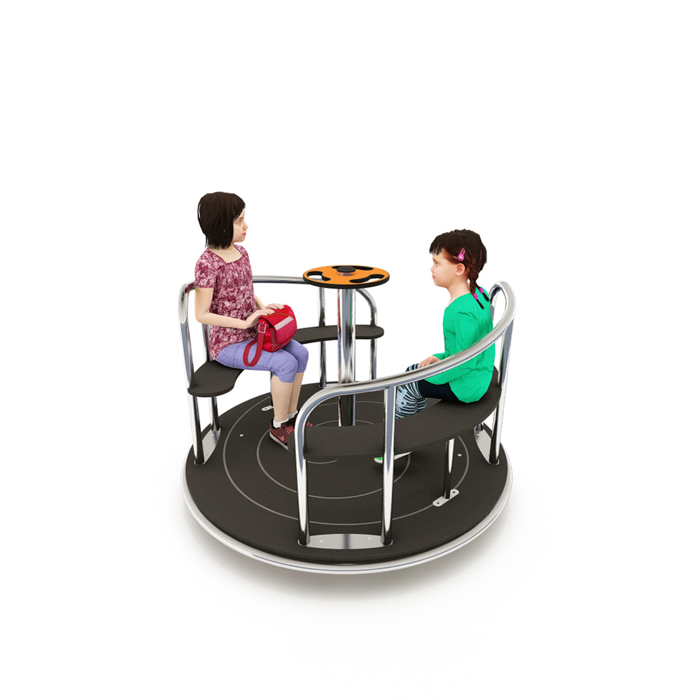 Carrusel con un diámetro de 1,5 metros. La estructura superior y poste central están fabricados en acero inoxidable con tubos de ø40mm y ø80mm, lo que garantiza durabilidad y resistencia al uso intensivo. La plataforma y asientos están fabricados en contrachapado fenólico antideslizante de 18mm de espesor.